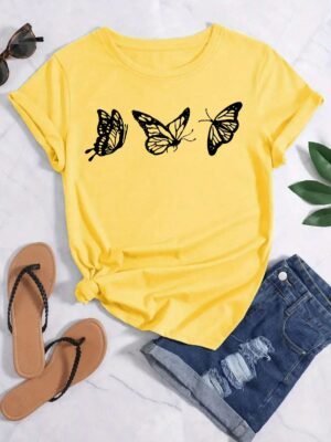 The vibrant yellow hue is complemented by the intricate butterfly design, making this t-shirt a true standout piece. Whether you’re headed for a relaxed day out, casual gatherings, or a stroll on a sunny day, its eye-catching design will leave a lasting impression.